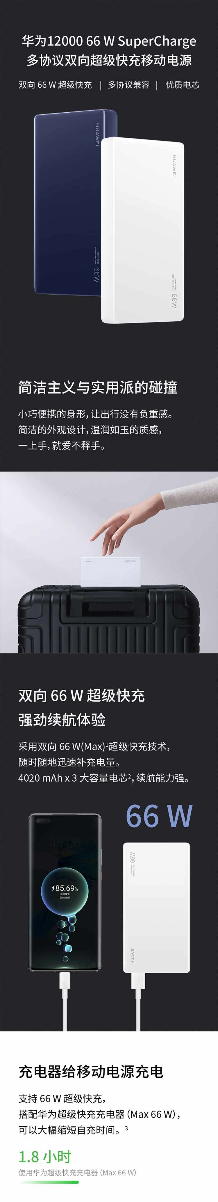 这款华为HUAWEI 原装12000移动电源/充电宝 双向66W超级快充/优质电芯 适用Mate40Pro/MateBook XPro 蓝CP020这款充电宝超级喜欢,前面一直没货,终于抢到了,很喜欢,体力小,携带方便,试了一下,是超级快充,支持京东,点赞(?ò ∀ ó?)
