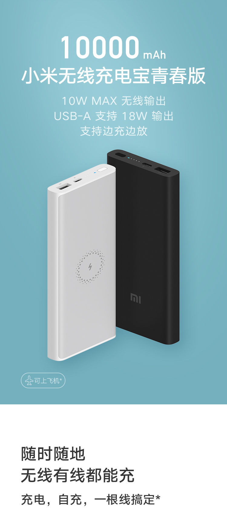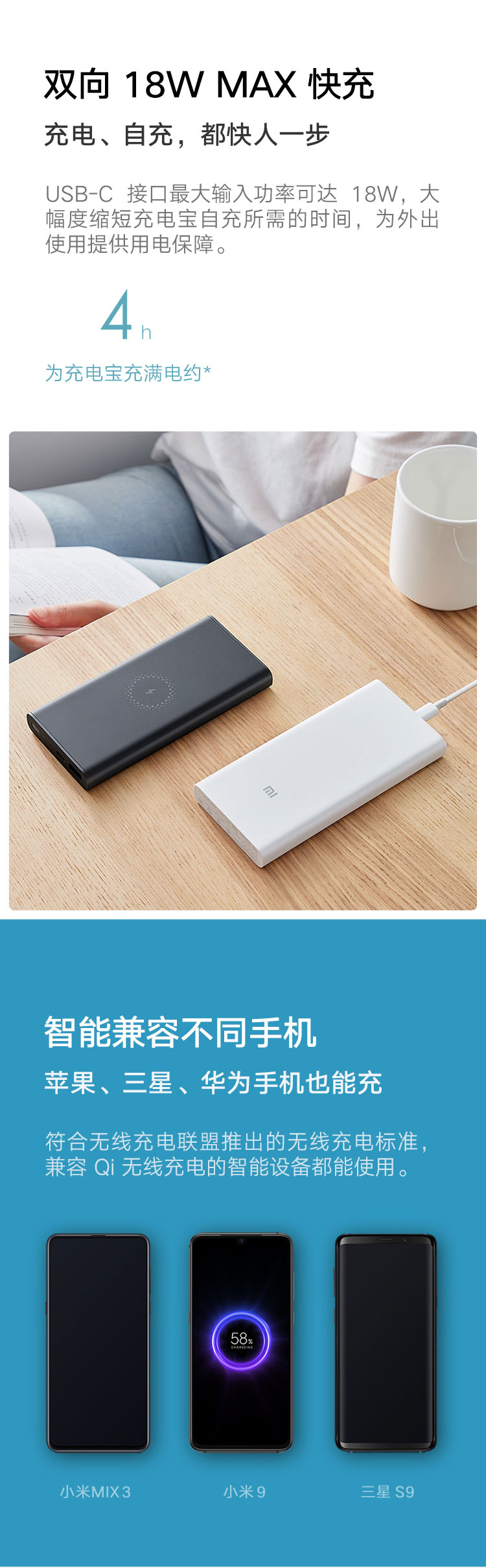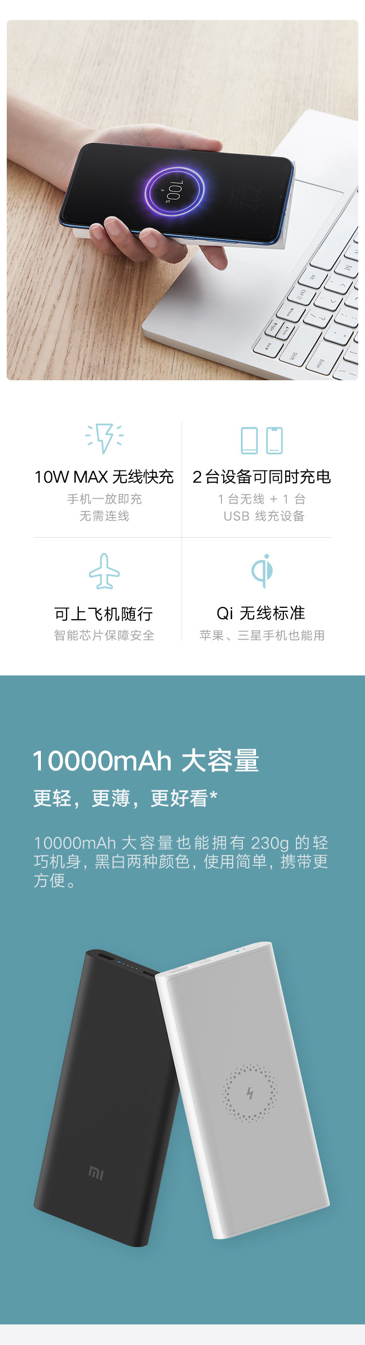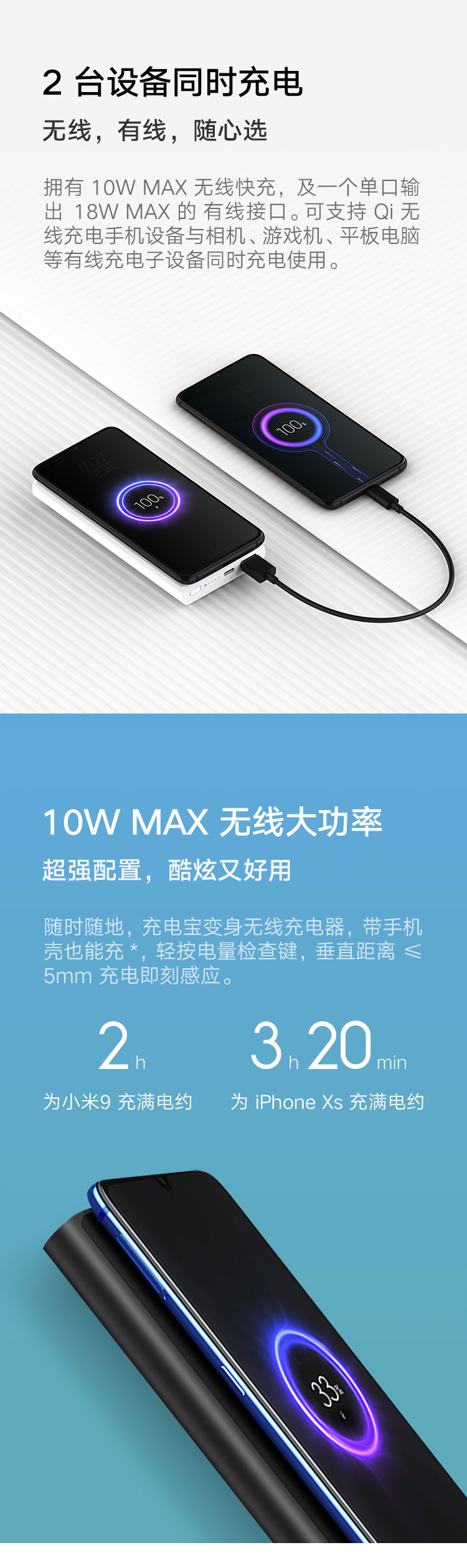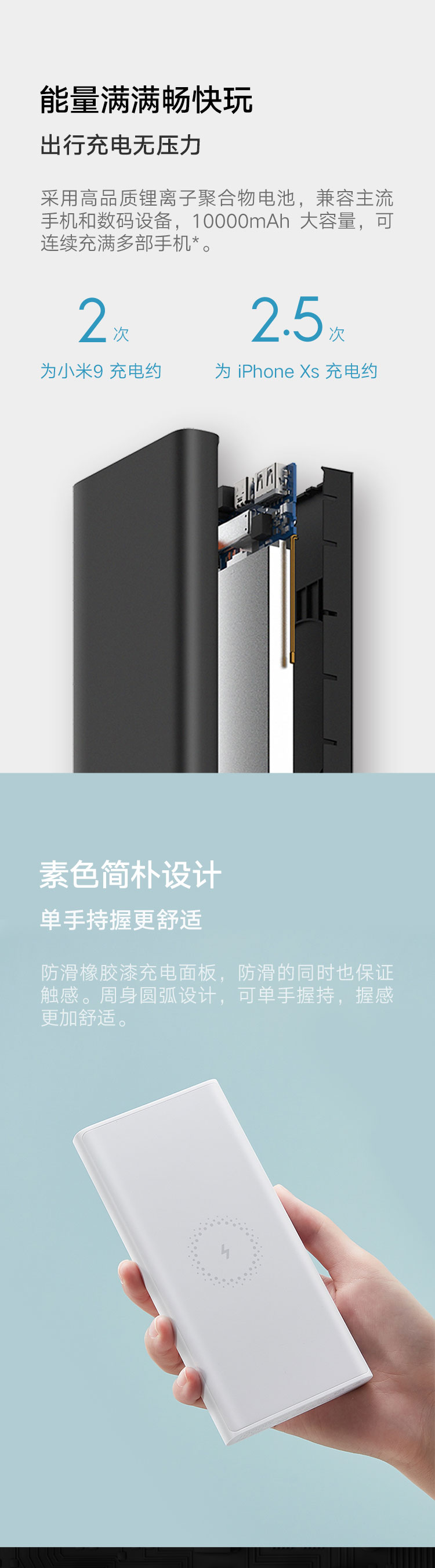移动电源非常好用 出门再也不用带线了 充电宝和手机往桌子上一放就能充电 而且还可以给我的蓝牙耳机充电盒无线充电 非常方便 就是10w无线确实不是很快 希望小米以后能再推出30w以上的无线充电宝就更完美了