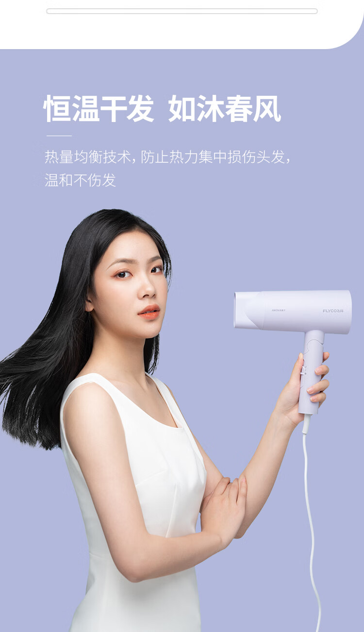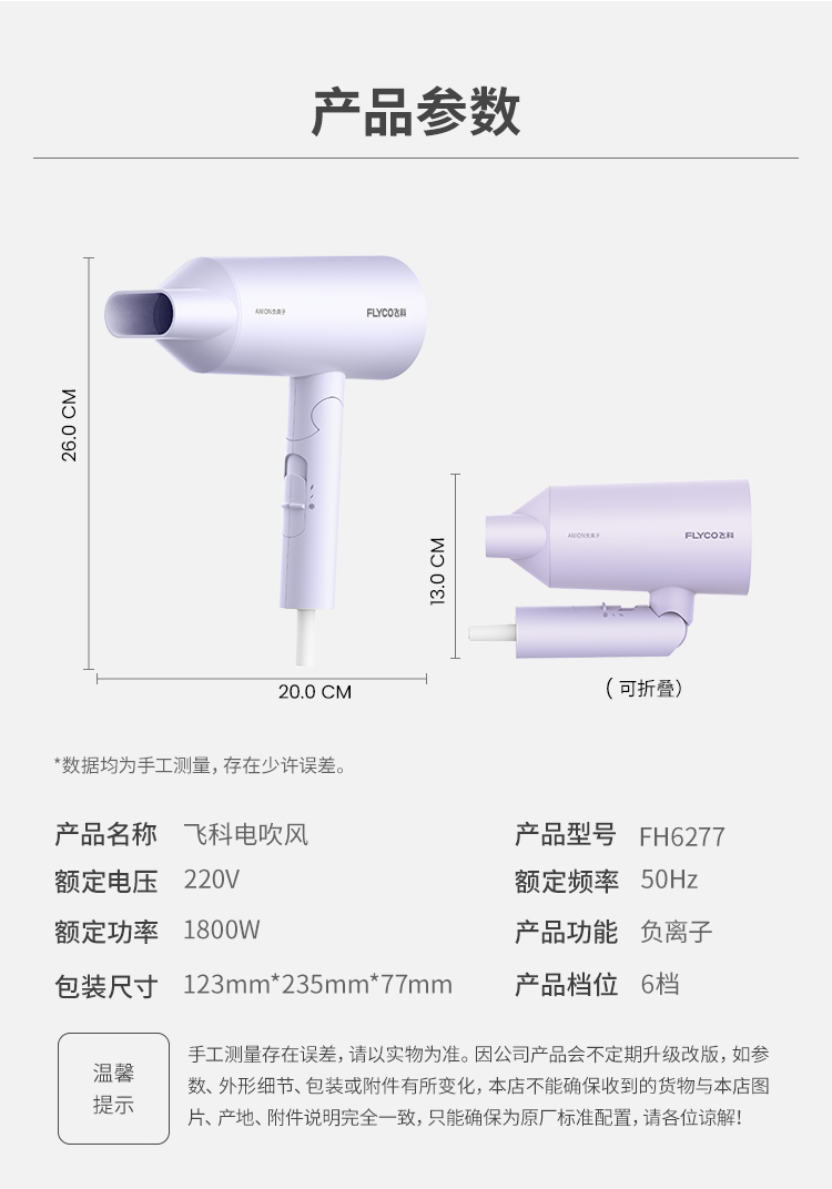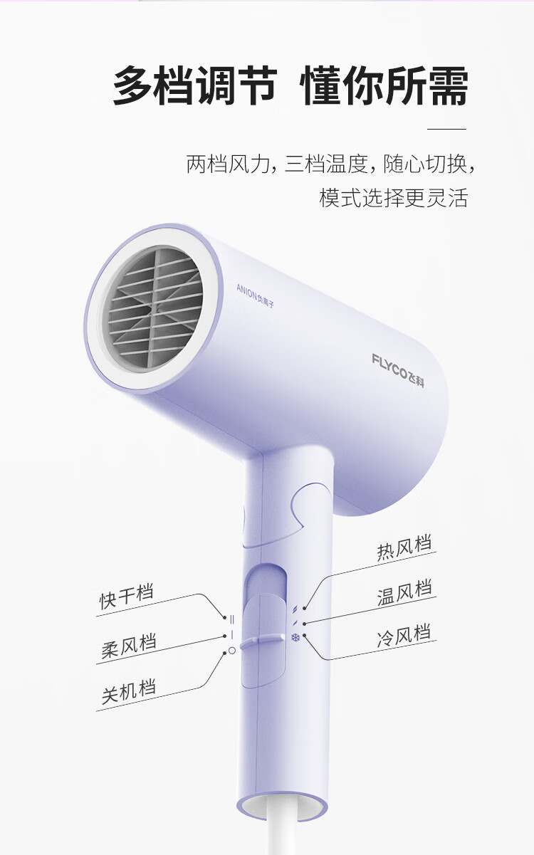 飞科吹风机,已经无数次回购了,这次京东有活动,少用了,几,拾,块,京东大爱!质量很好,噪音小感觉比较轻柔,圆筒形风筒可以折叠风速,档位多,可以自由调节外观设计精美,大方纯白色,看上去就很简洁本书是吹干,定型,质量过硬,值得信赖,飞科大品牌,很不错。飞科电动系列产品质量一直有保障,吹风机噪音不大,吹干效果很快,有冷风和热风,并且有高低档位调节,可以用来吹造型。飞科这一款吹风机,外观时尚,吹干效果强,三个温度档位这样的设计非常好使,用者可以调节,手柄可以折叠收纳,外出携带也很方便,这款设计朋友看见了,也觉得很喜欢。包装收到,非常的完好,通电小试了一下,风速风量都很好表面制作很精良,是很用心的一款产品。飞科外观设计简约大气上档次,采用了三段折叠,拿上拿下都非常方便,多档位设计,超级棒!飞科吹风机外观美观,用料扎实精细,手感好大品牌,真的很值得信赖。飞科电吹风,外形时尚美观,拿到了就开始测试,风力还很强大,功率也比较大。吹干效果很好,风力够足,有几个档位,使用体验感非常好。冷热风随时切换颜色可以选择,但是我特地选了白色,显得干净利落也可以给狗狗吹毛发,分分钟就吹干了。飞科官方正品,不错。