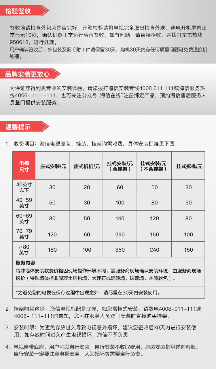 海信电视大品牌, 值得大家去信赖。 视频清晰好色彩, 全家开心乐开怀。 这个月买了两台海信电视机。这台是4K的,分辨率高,更清晰。自己安装,简单方便。网络电视,有线电视随便切换,海信客服服务态度很好,及时电话沟通,传递送货信息,快递小哥送货上门,服务同样好。