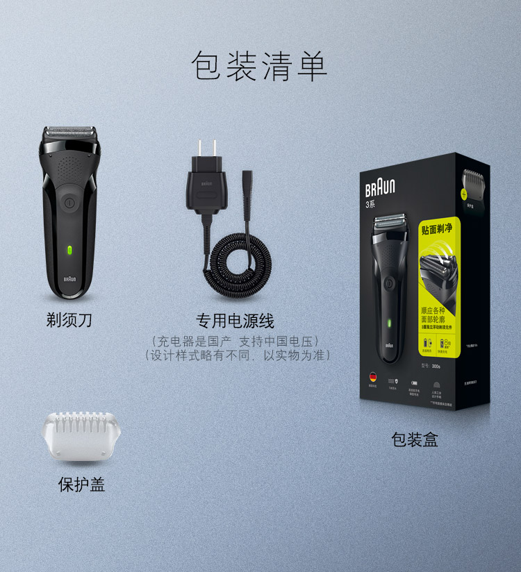 包装很精致,很不错,第二个博朗的剃须刀,第一个还是从实体店里买的,也是人生的第一个剃须刀,用了好多年,是更换电池的那种,很好用,前几天突然的把那层网给整破了,刮着很疼,所以就忍痛换掉了,多款选择还是这个性价比高。还送独立收纳盒,很不错。出差方便携带了。