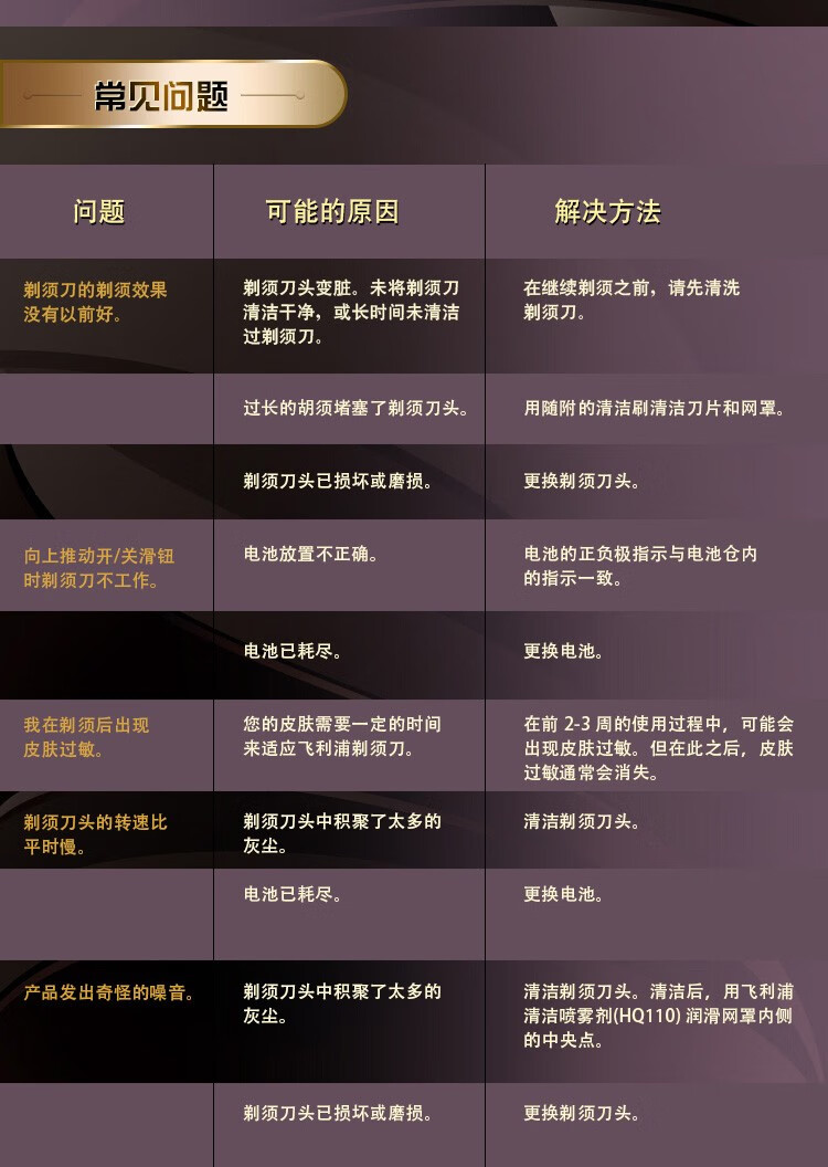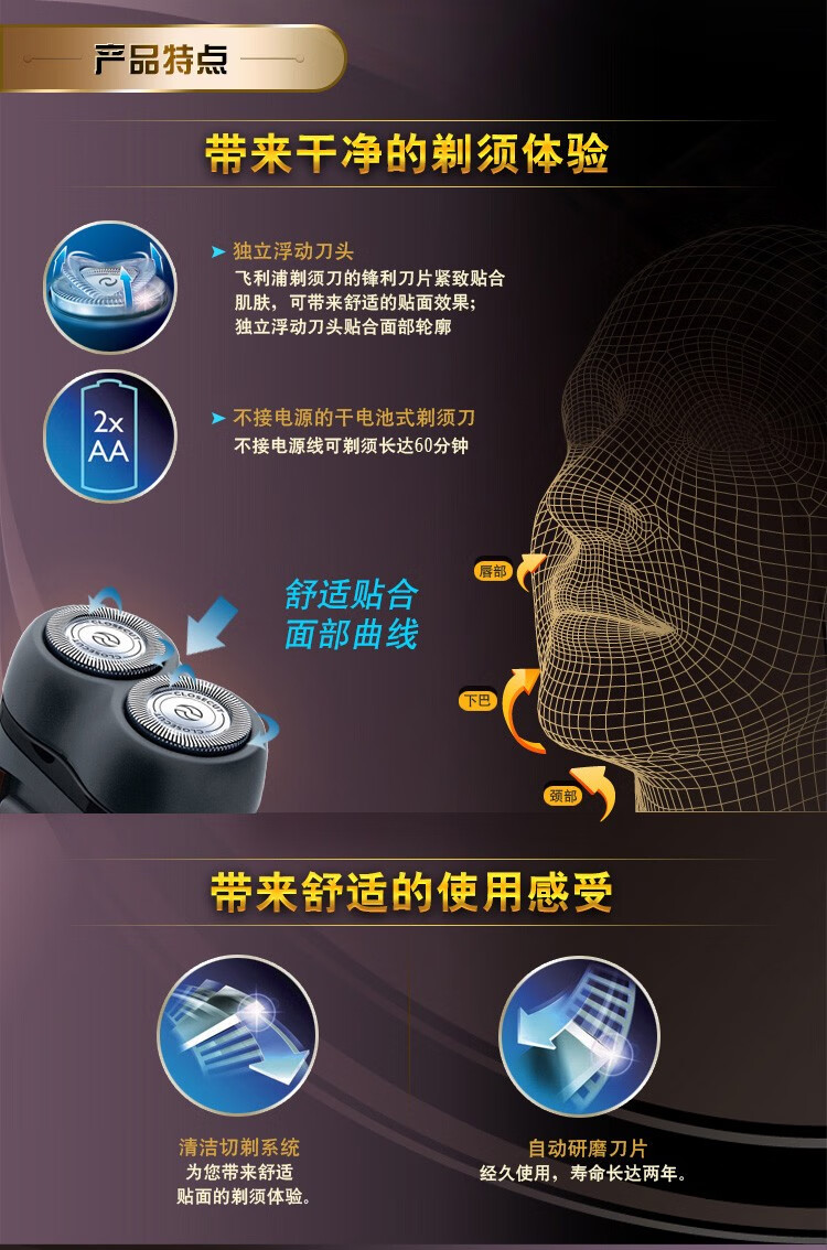 飞利浦的剃须刀还是蛮好用的,2节5号南浮电池,可以用很久,剃须刀握感很好,剃须时刀头顺滑紧贴面部,声音小,操作方便,比之前用的好多了。