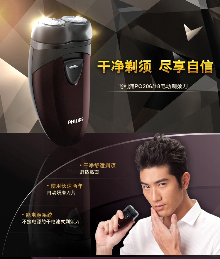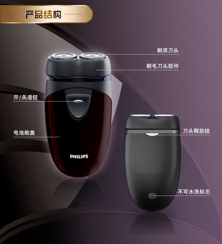 飞利浦干电池免充电便携式剃须刀小巧精致,携带方便,喜欢这种装电池的,免去充电的麻烦,进口刀头,刀片锋利,刮的很干净,很不错哦~