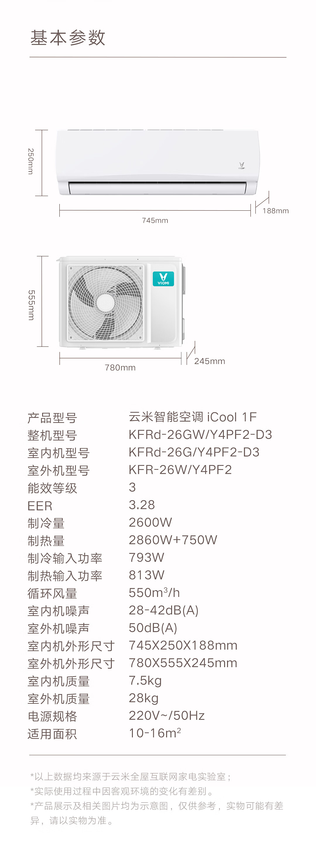 • 产品名称:云米(VIOMI)1匹 定频 冷暖 iCool 1F 制热取暖器暖风机 智能除湿 壁挂式卧室空调挂机 KFRd-26GW/Y4PF2-D3