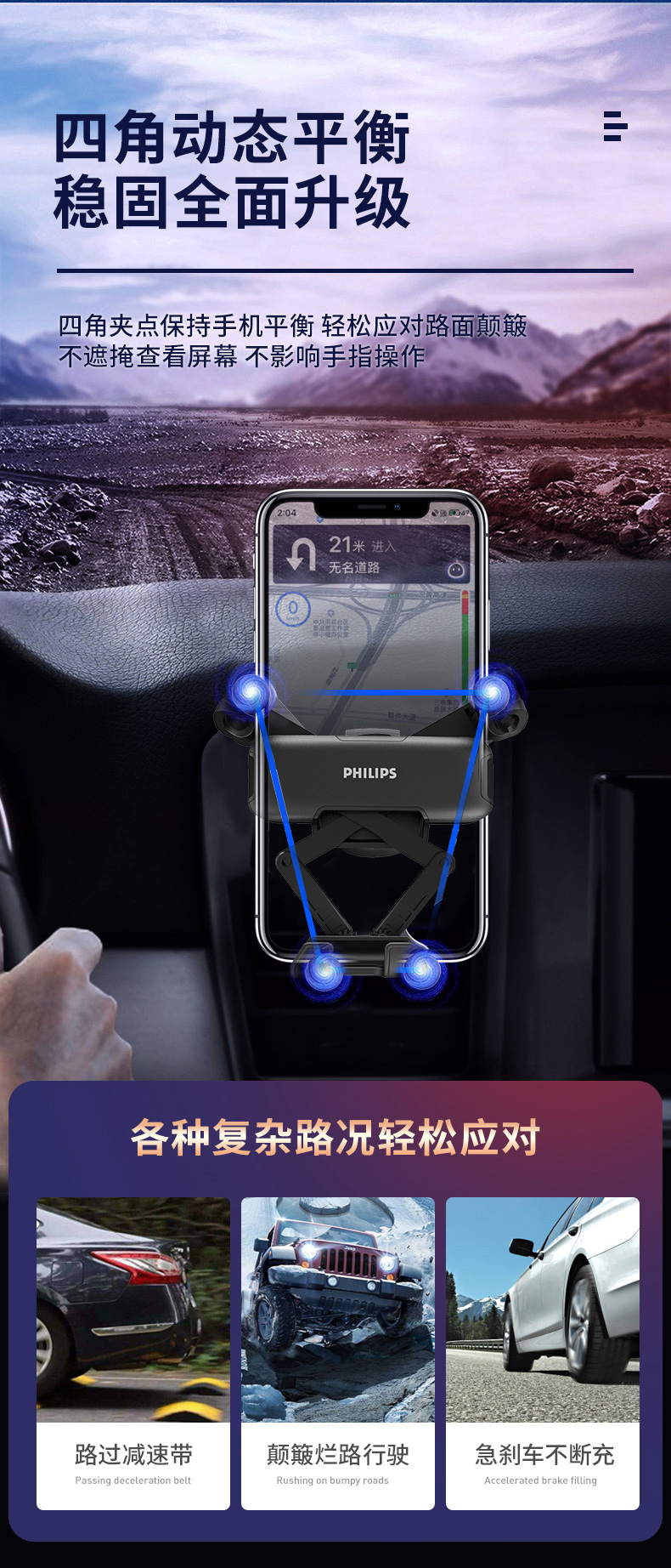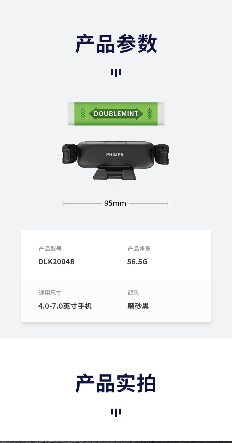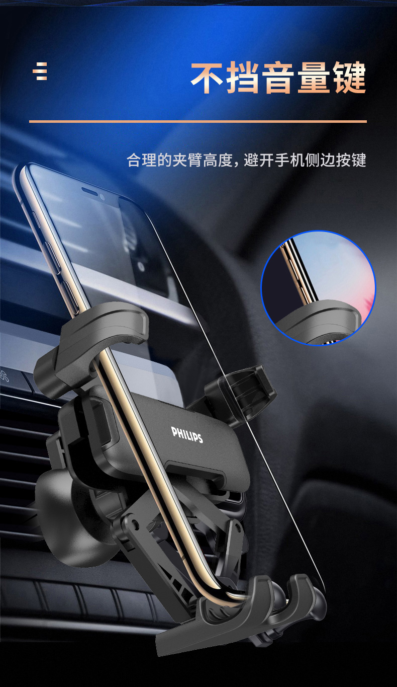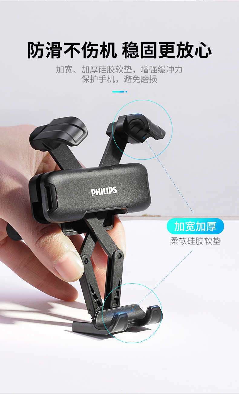 外形外观:在造型上,还是挺好看的,飞利浦的logo看起来还是很高端的,无论放不放手机看起来都是OK的。 稳定度:放上手机夹的还是很结实的,后面的卡扣也很结实,不会因为颠簸掉落。 结实度:手机支架的材料还是很好的,强度也很高。 使用难易:是用起来很方便的。
