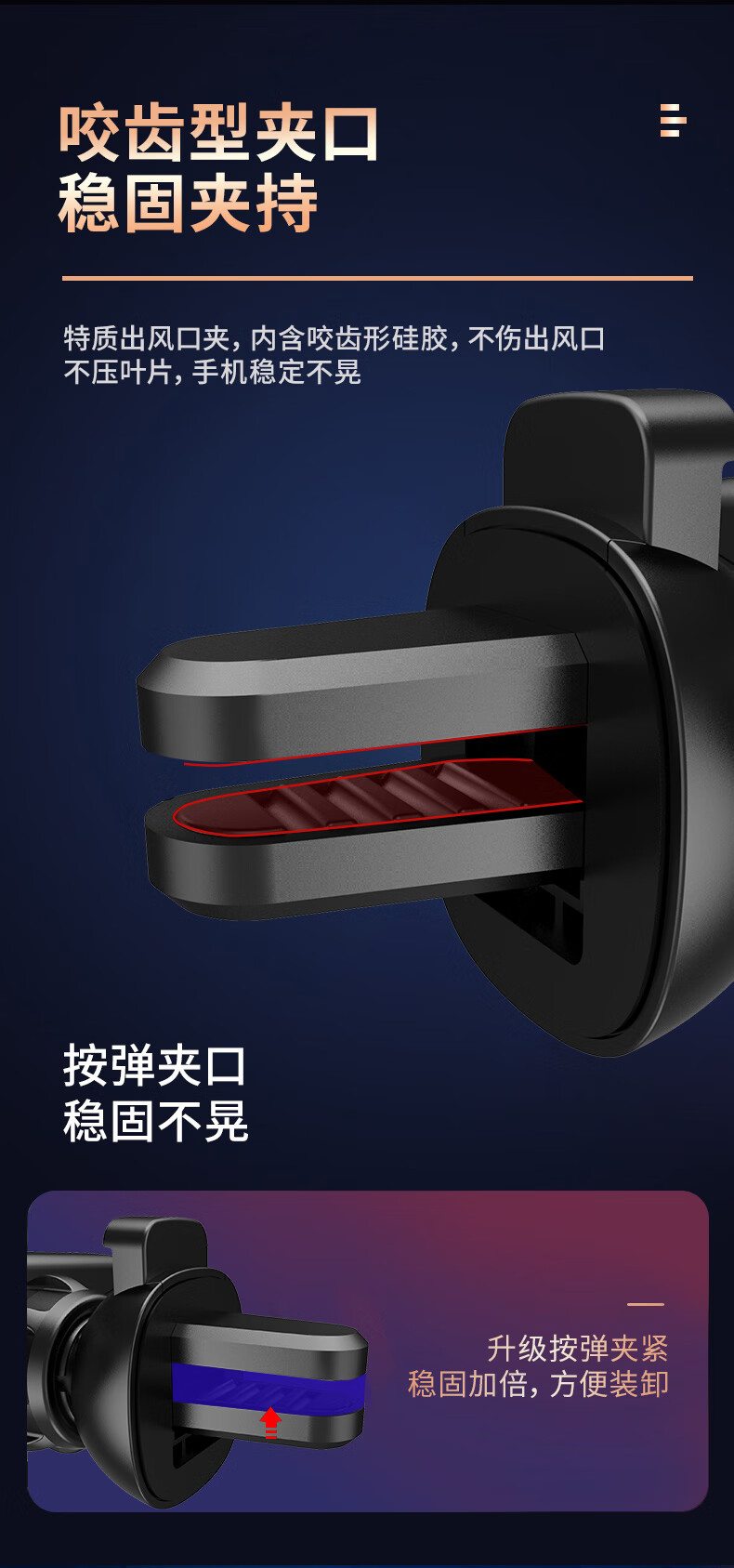 很结实,耐用。尾部可以固定在空调出风口,不会晃动。尾部可以多向调节角度,适合不同司机换着开车。自重下垂卡口,不遮挡开关键,设计比较合理。