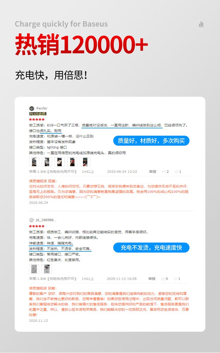 倍思的品牌是一直很欣赏的,然后又给老公买了一条华为的,很结实,而且充电的头是铝合金的,很棒,很长,我这种哄孩子睡的长的充电线最舒服