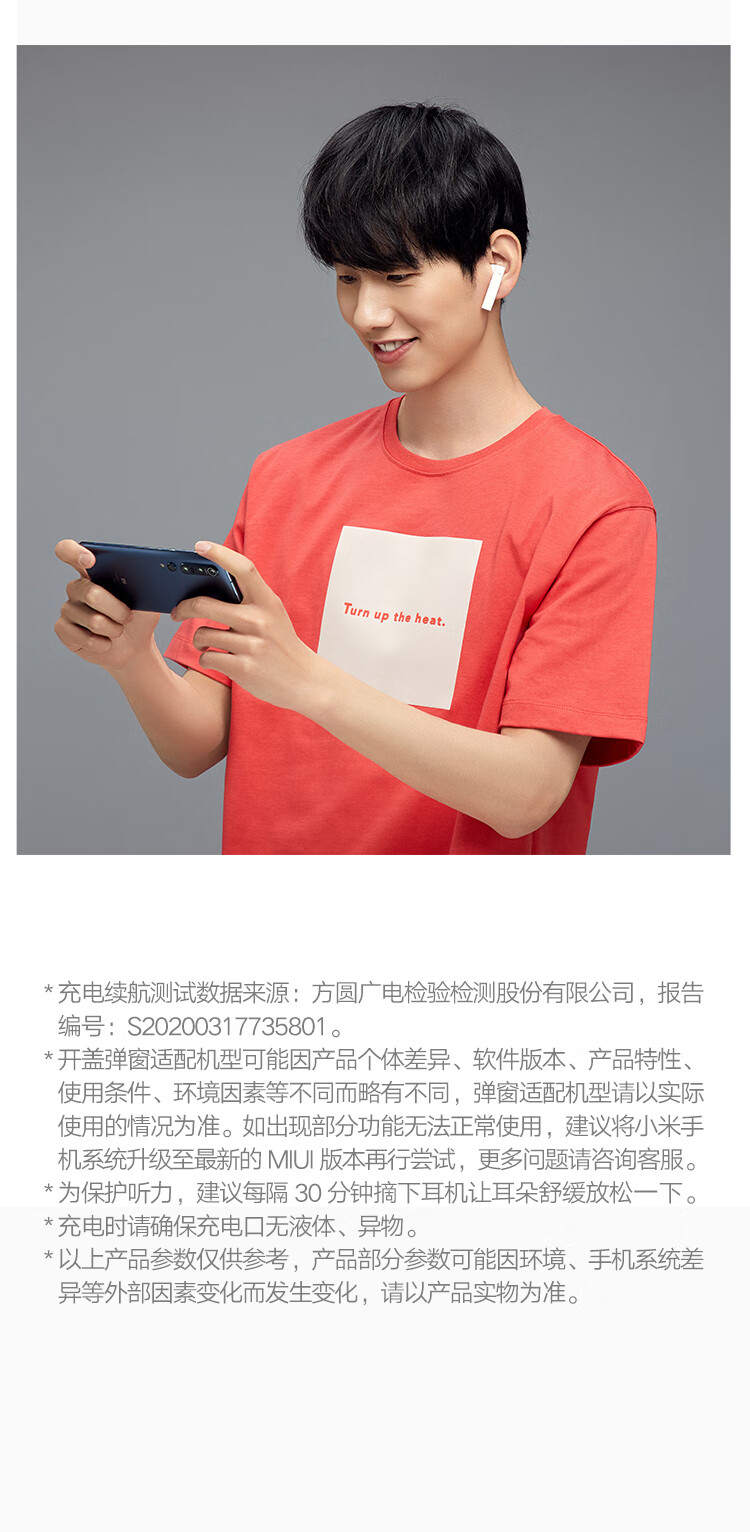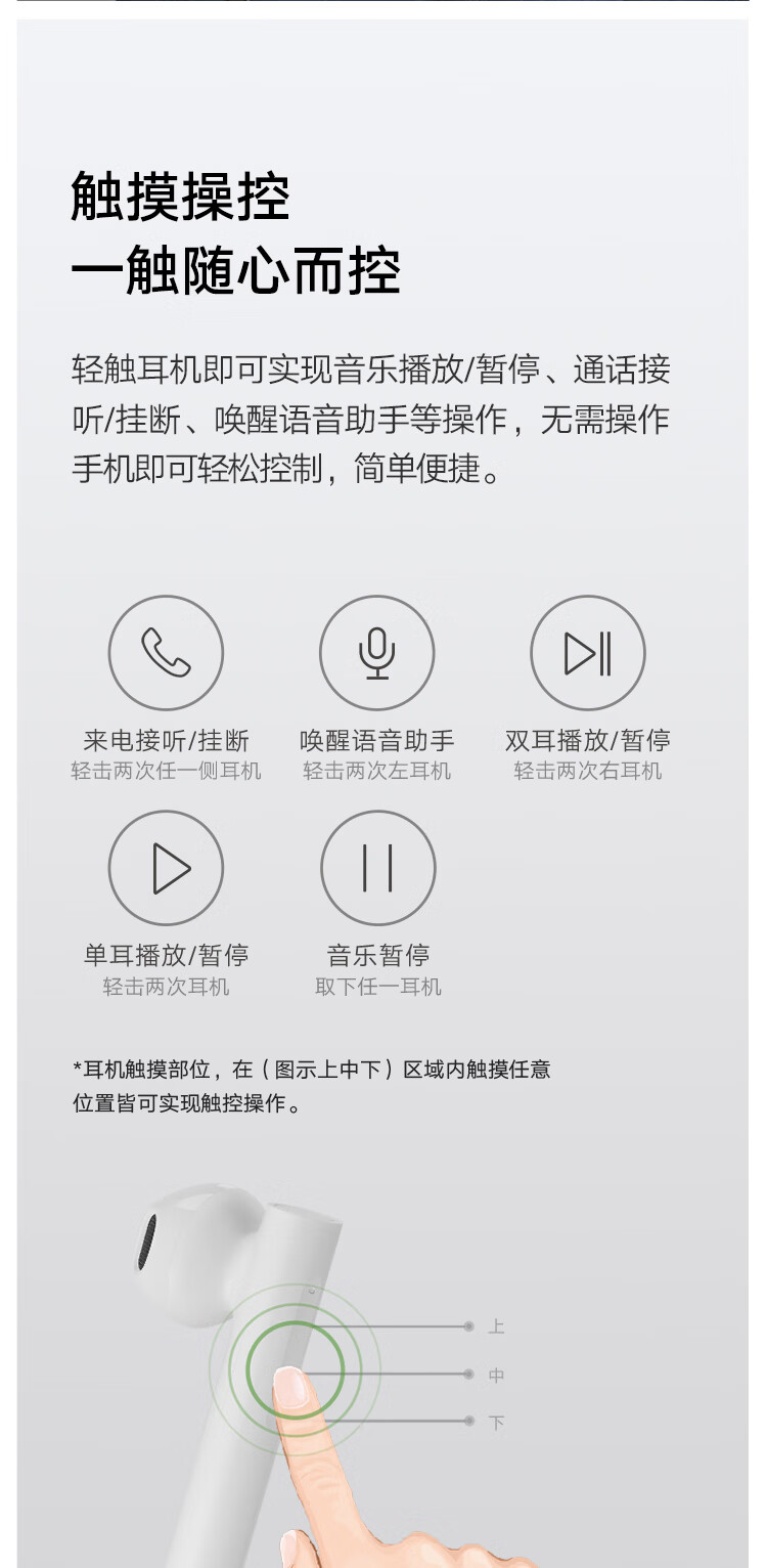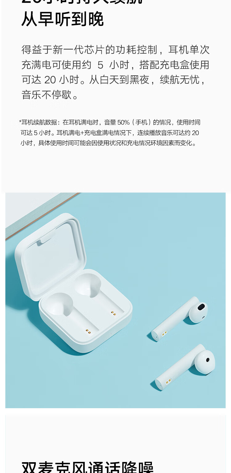 做工质感:棒做工666.音质太棒了,舒适度很好,续航给力,你值得拥有,真无线立体声耳机,人体工程学半入耳式设计,佩戴舒适稳固,敲击控制(防止误触),本地快捷语音功能是最棒的!直接说出& ldquo;下一首& quot;就能下一首,蓝牙V5.0版本,超低功耗,超低延迟,比我的漫步者 lollipop延迟低,实在是太棒了,快买吧,京东物流666,1、小米自家出的果然 ok,搭配我的小米9蓝牙5.0,回连接速度快,也是设计的好,它不是拿起开机,而是开盖开机,所以连接速度真的快。2、信号稳定也好,比我的漫步者 lollipop好。专门设计的频射天线很赞。3、双 mic通话降噪直击用户痛点,我之前不喜欢漫步者小豆豆形的蓝牙耳机就是因为通话降噪始终是敌不过有双 mic降噪的蓝牙耳机。4、敲击控制好评,自己用过触摸控制与按键控制的,触摸会误触,按键耳朵疼敲击控制无疑是目前比较好的解决方案。5、用上 type- C。6、离线语音控制好评!期待之后固件更新更多。7、耳机背面的字刻好评,很细节,喜欢。