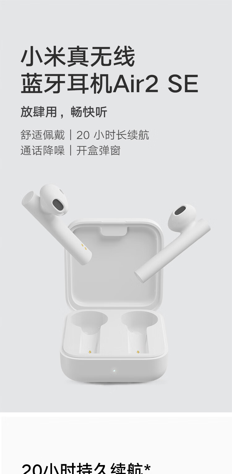 一直想买一款无线蓝牙耳机,苹果的太贵,这次小米新出的AIR2SE价格非常实惠。盒子外观小小的,好似放进口袋里的粉饼盒,女孩子放在包包里也一点都不占地方。方方正正的外形设计,白色素雅,在视觉观感上非常讨喜。背面则是Type-C充电口。打开盒盖,里面是耳机本体,盒盖是磁吸式设计。半入耳式佩戴设计,贴合耳道,非常舒适。耳机上半部分有触摸区域,可实现触控操作。手机在打开蓝牙状态时,拿出耳机可自动连接,非常方便。总而言之,性价比高,还是非常喜欢的。