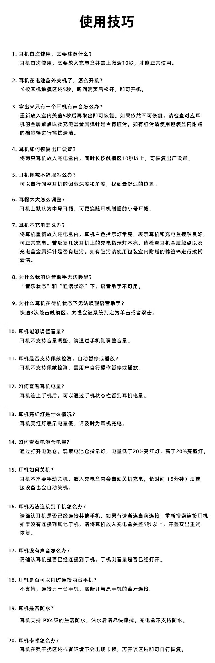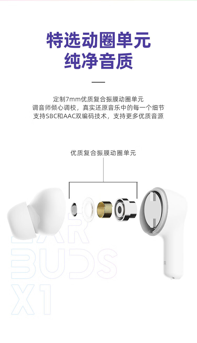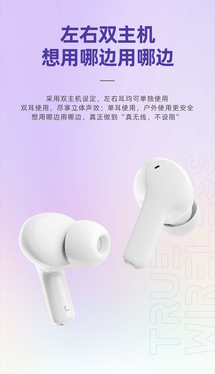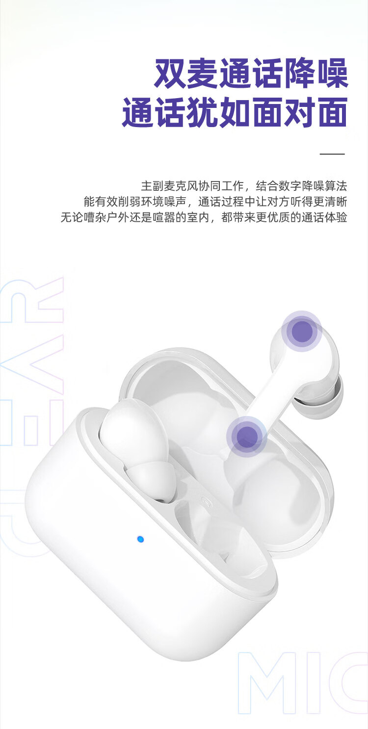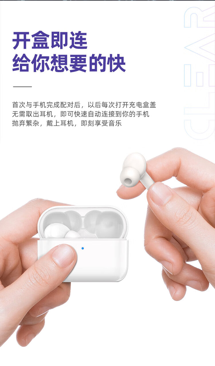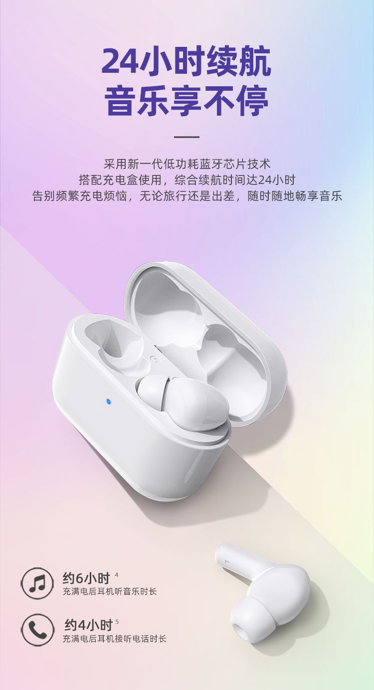 做工质感:质感好,白色给人一种大气、纯洁的感觉。 音质音效:低音很不错,整体音质很好。 舒适度:入耳后不容易脱落,我跑步时戴着很好。 续航能力:续航能力强,一直用几个小时没问题的,沒重度使用过。 其他特色:充电盒小巧便携,外观很好看。