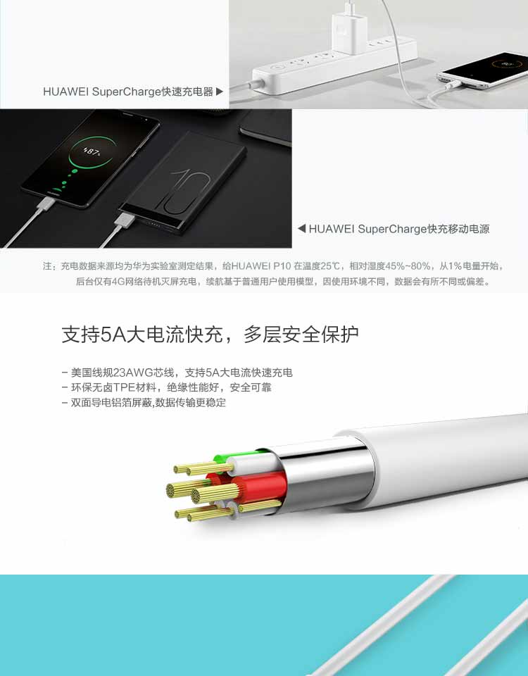 华为的type-c接口数据线,线径粗壮支持5A快速充电和数据传输,用来给荣耀v20充电,充电相当不错,速度快,支持扫描查真伪,京东买的放心。快递很给力,晚上下单,第二天就送货上门了,给快递点赞。