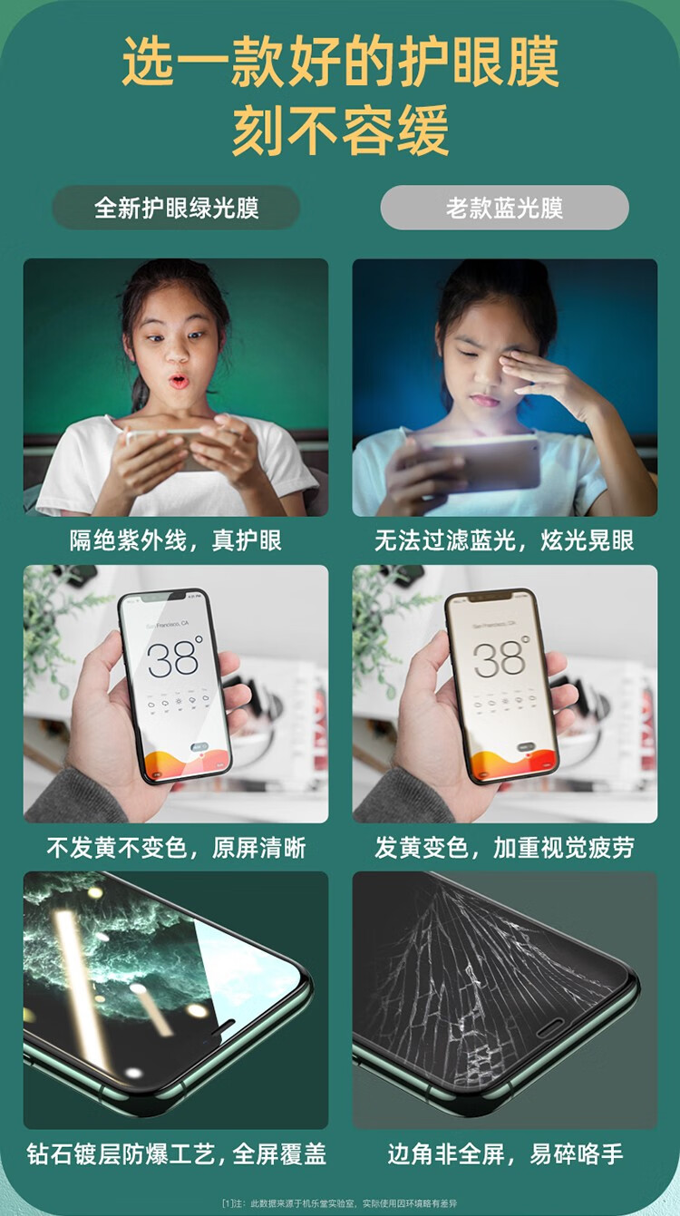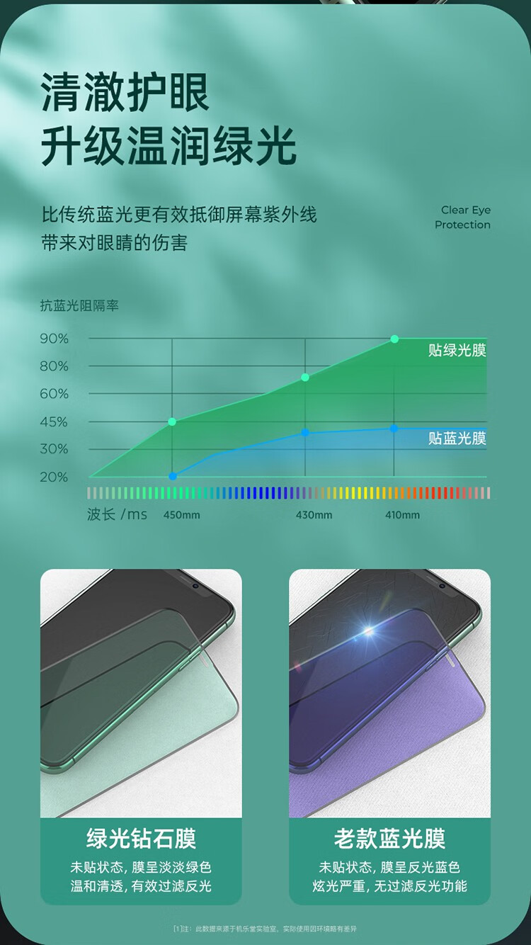 绿光的膜很透彻,用起来很舒服,对眼睛好,而且这个贴在我新手机上不会挡到屏幕,保护性超强,边也是非常细,屏幕显示面很大,玩手机别提有多舒服了,很赞。