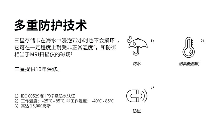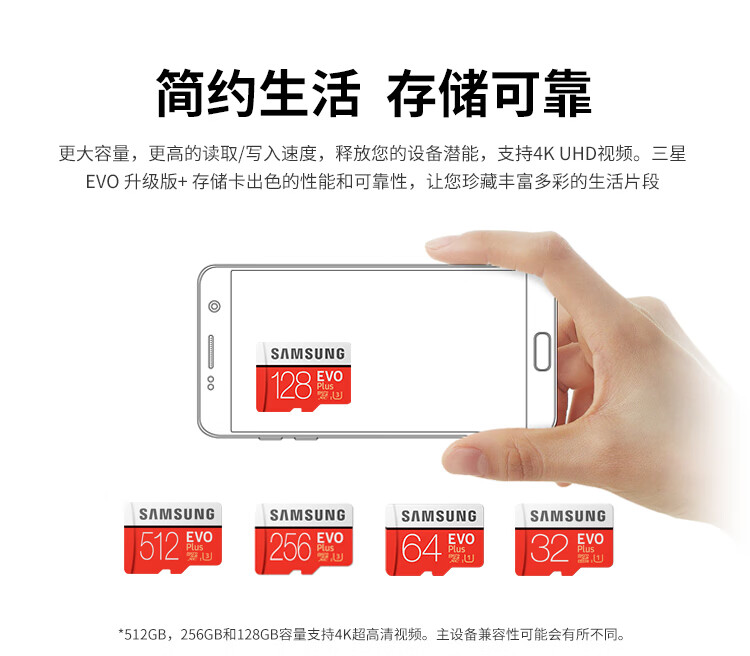 它的尺寸和NanoSIM卡相同,比MicroSD卡小得多,可以直接放在SIM卡槽中使用。但是,**存储卡的售价是MicroSD卡的2倍到3倍,性价比不高。此外,三星也推出了独特的"UFS存储卡”,它的大小和MicroSD卡相似,只是采用了更醒目的鲨鱼鳍造型,金手指居中且数量更多,读写速度分别可达500MB/s和200MB/s,可惜它的价格更贵且仅适用于三星旗下的高端笔记本。 从gopro到佳能再到大疆一直都是在用三星的内存卡,质量非常稳定可靠。这次又买了新的大疆无人机,直接配一个三星128的内存卡,航拍再也不用担心内存不够了。