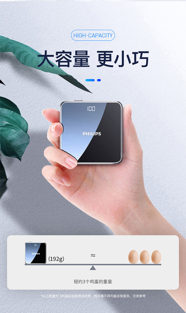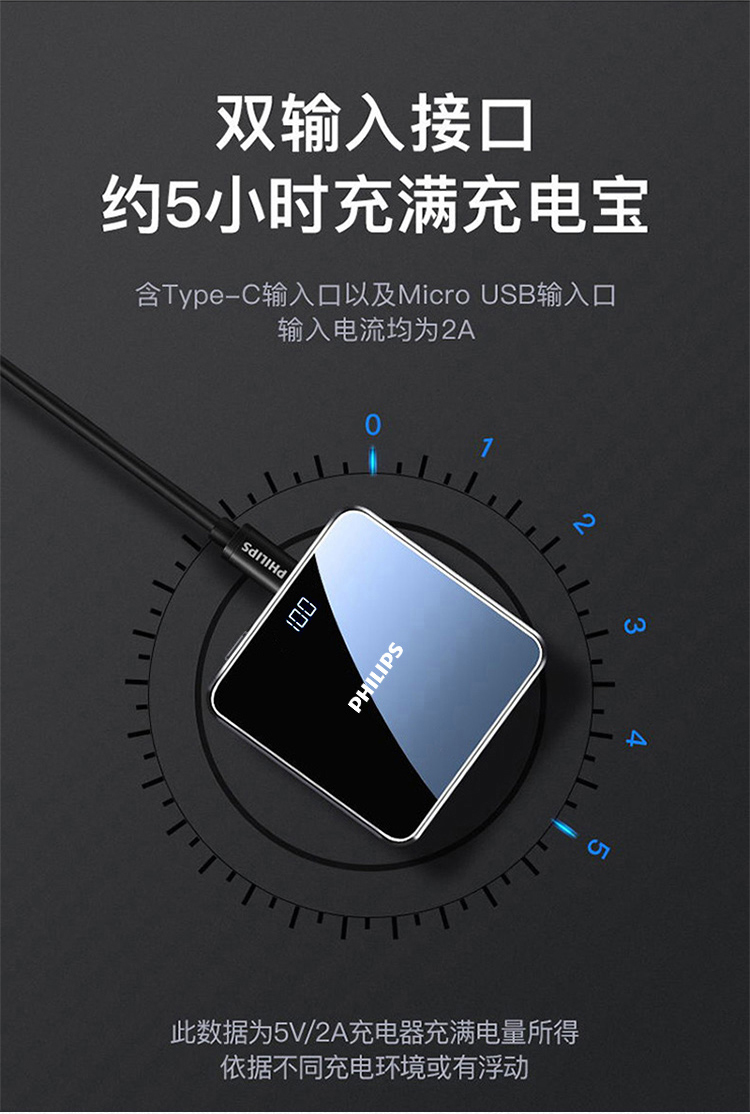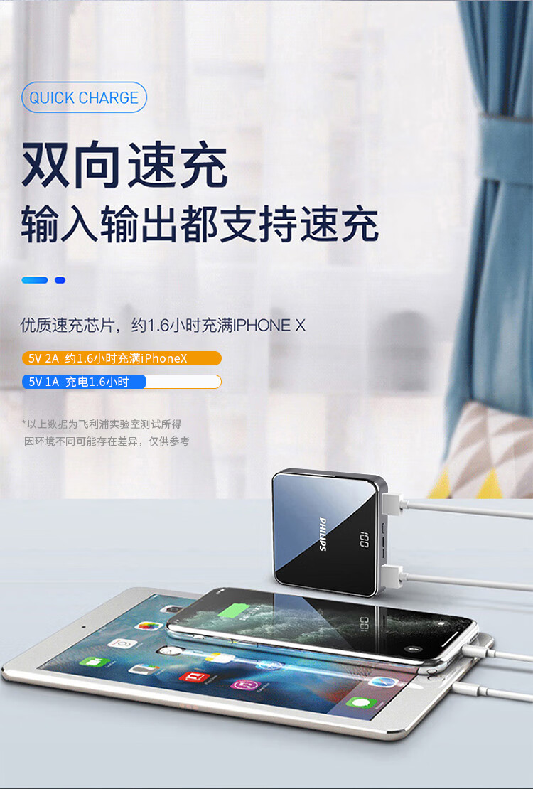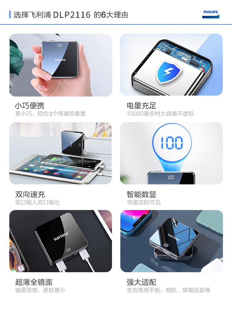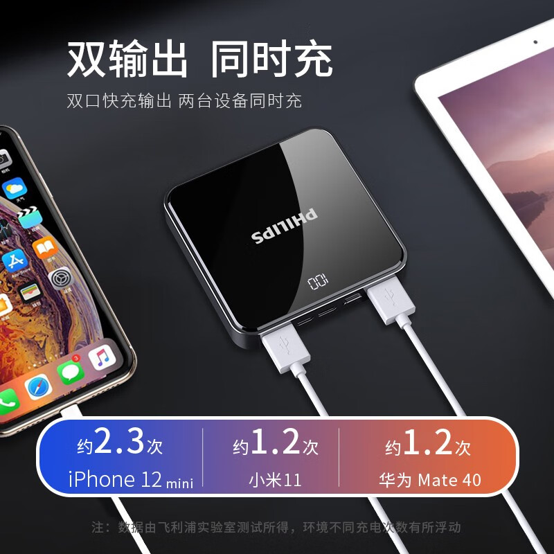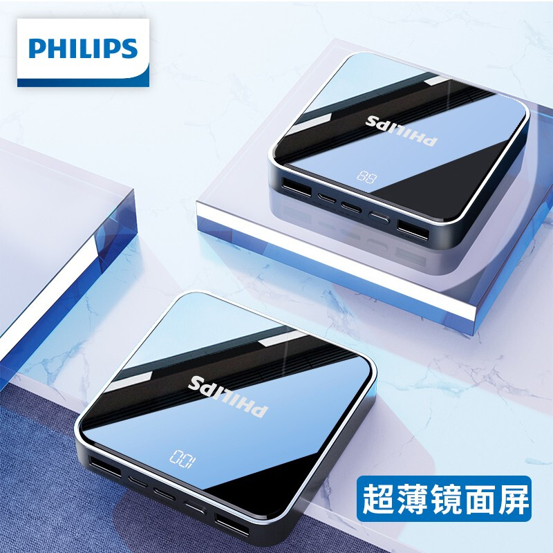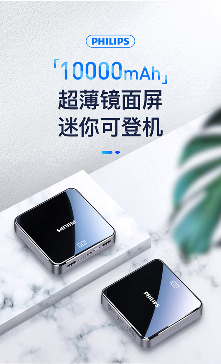 • 产品名称:飞利浦10000mAh充电宝超轻薄全镜面智能数显迷你大容量便携小巧双入双出适用于苹果华为小米手机平板移动电源