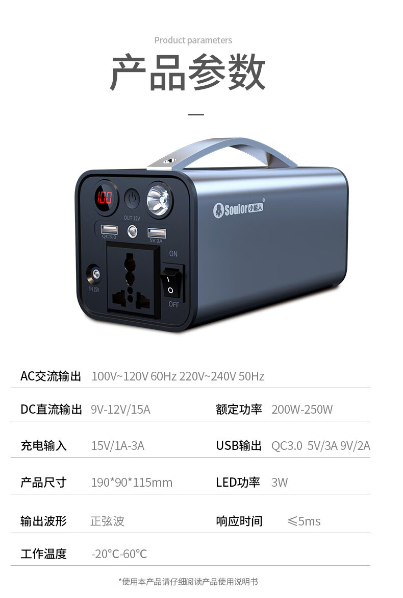 • 功能:储能供电,逆变电源,数码产品充电,手电筒/SOS,电量显示