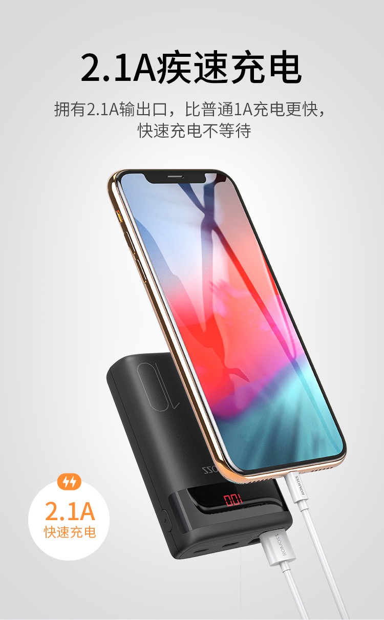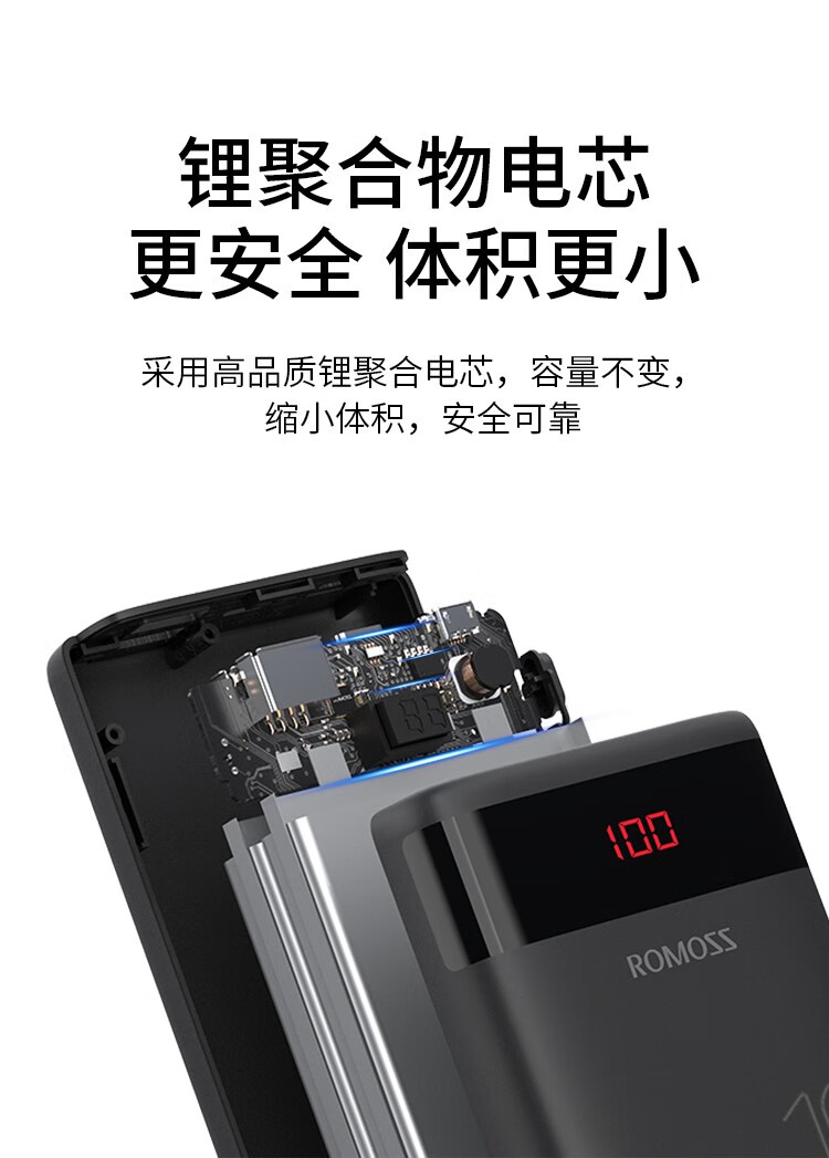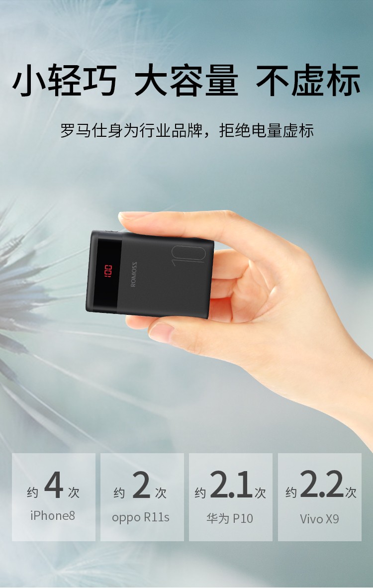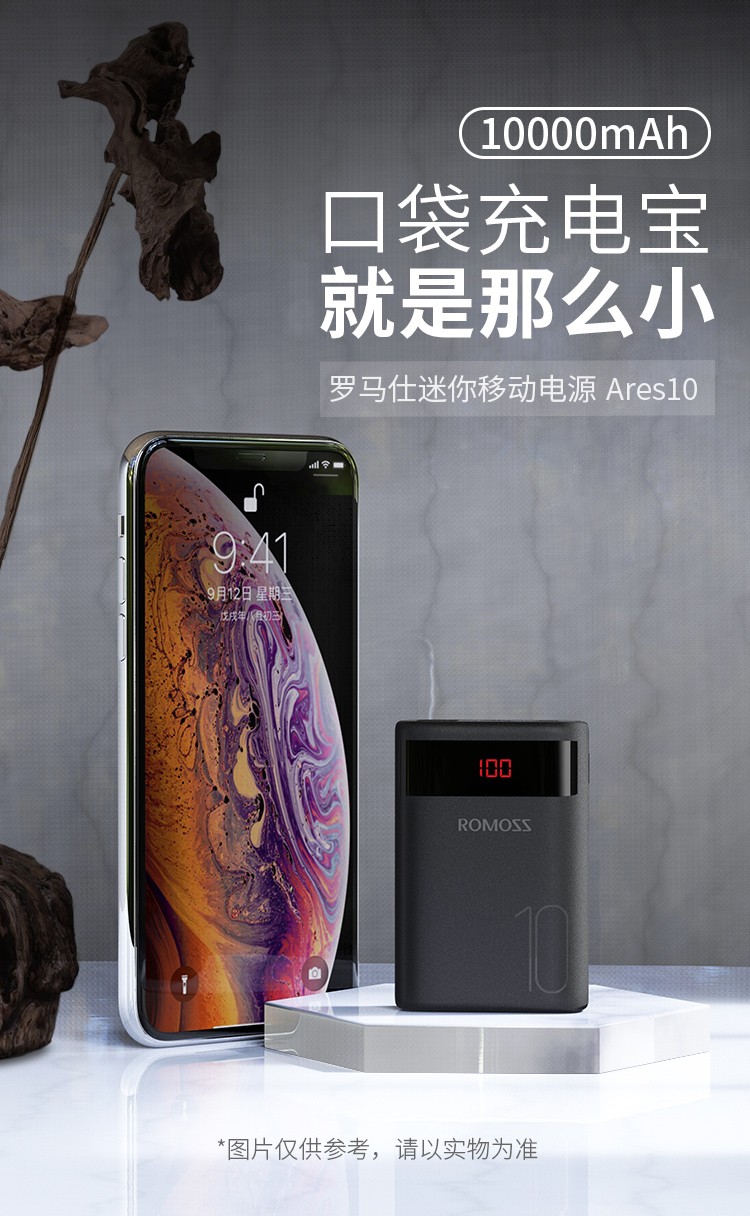 • 产品名称:罗马仕Ares10充电宝10000毫安时移动电源超薄小巧迷你双USB输出智能数显苹果安卓Type-C 黑色