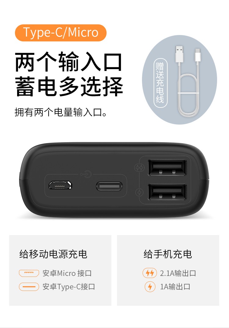 • TYPE-C输入: 支持TYPE-C接口为移动电源充电 支持TYPE-C输入