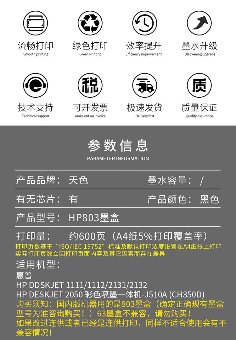 • 产品名称:天色适用惠普803墨盒HP Deskjet 2622 2131 2132 2130 1111 1112 2621 2632 2628打印机803XL黑色