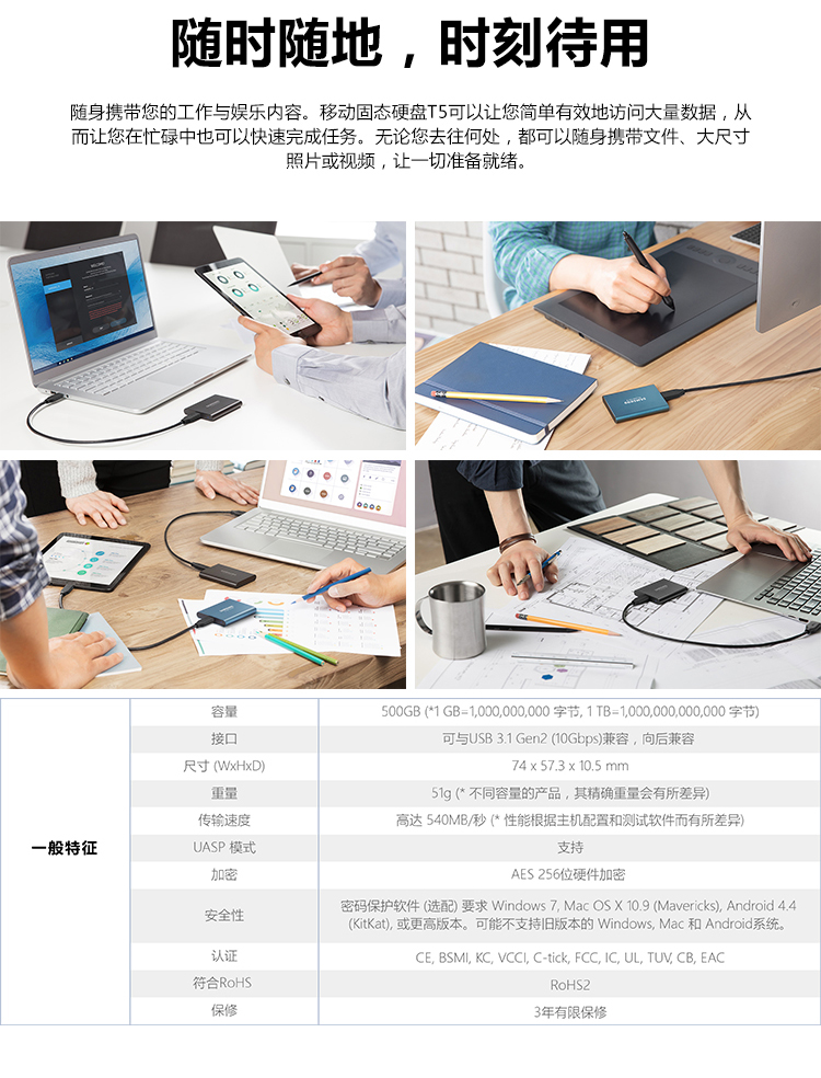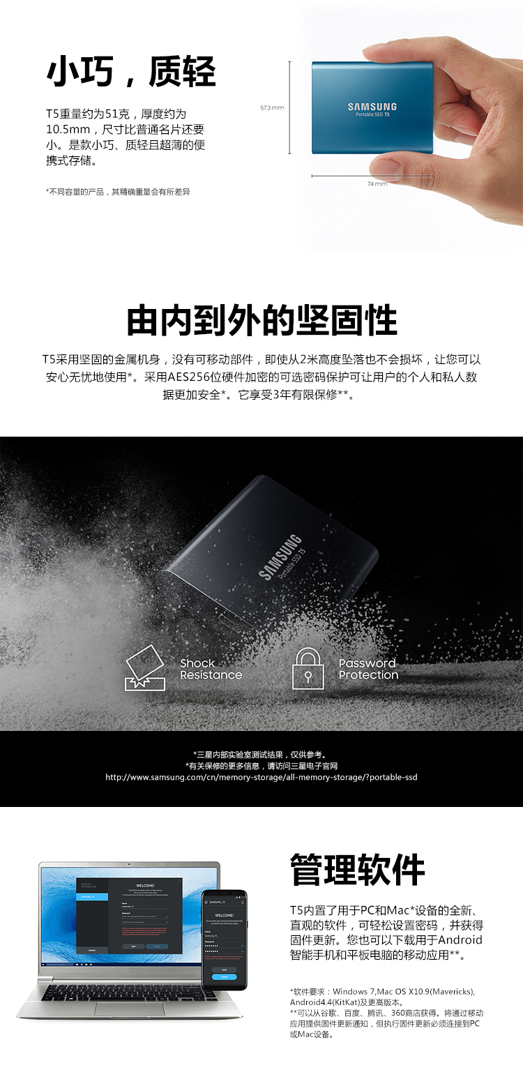 • 产品名称:三星(SAMSUNG) 500GB Type-c USB 3.1 移动固态硬盘(PSSD) T5 蓝色 传输速度540MB/s 京东牛年定制款