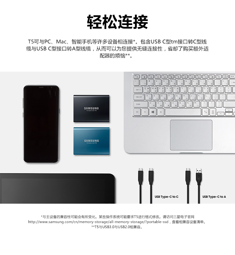 • 三星(SAMSUNG) 500GB Type-c USB 3.1 移动固态硬盘(PSSD) T5 蓝色 传输速度540MB/s 京东牛年定制款
