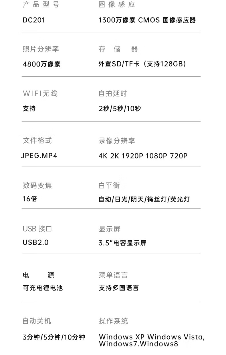 • 产品特性:大底卡片,WIFI连接,美颜自拍